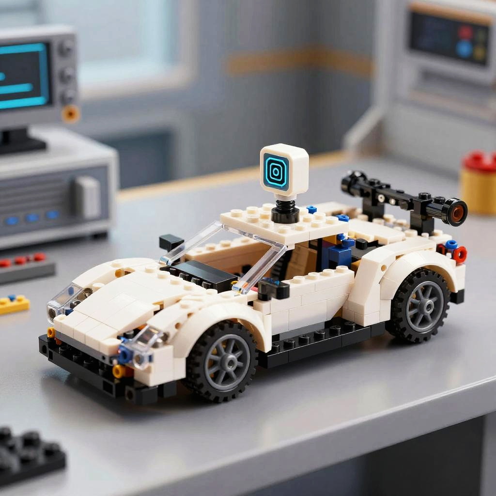 Lego car AI prototype, compact toy car assembled from classic Lego pieces with embedded artificial intelligence sensors, set in a high-tech workshop, realistic textures, detailed mechanical components, bright and engaging composition