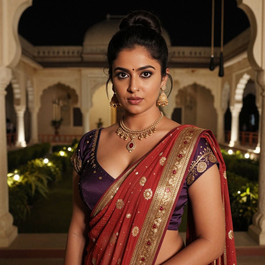 Photograph of a beautiful Indian woman with dark hair in an updo, wearing a red and gold sari, intricate jewelry, and a dark blue