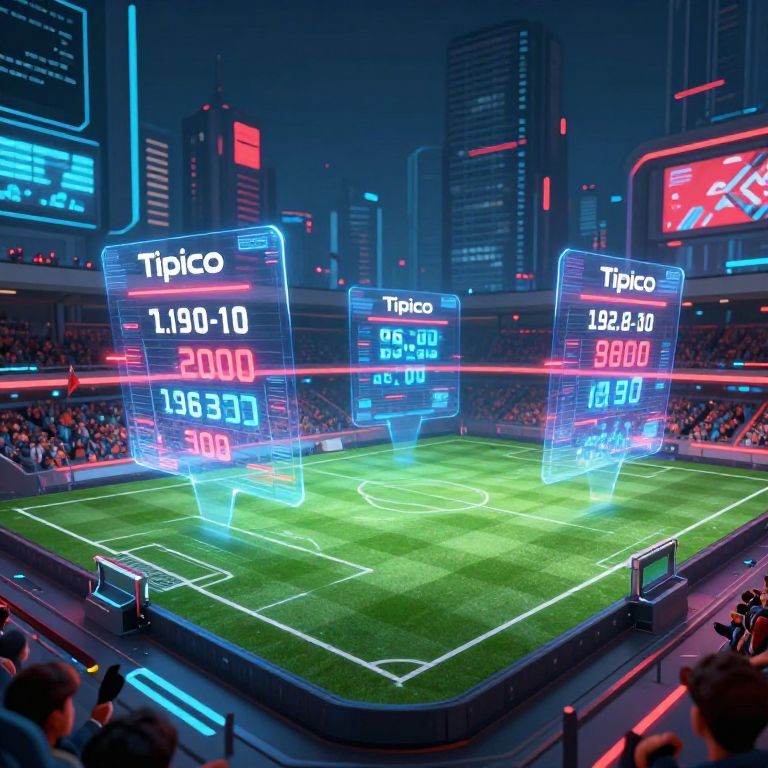 Futuristic sports betting scene featuring Tipico branding, holographic odds floating over a digital football pitch, cyberpunk cityscape in background, neon blues and reds, high-tech atmosphere and vibrant energy.