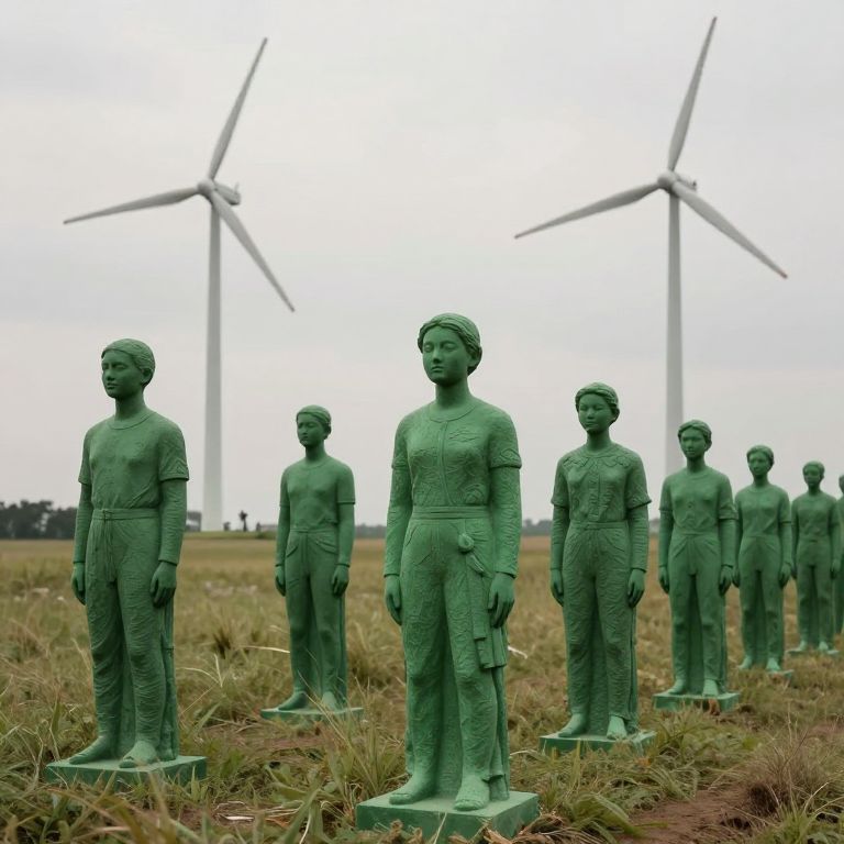 In a field where wind turbines hum softly, a procession of verdant statues stands solemnly, their forms whispering forgotten melodies that resonate with the melancholy beauty of transience and the enduring spirit of invention.