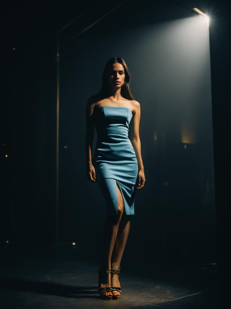 Woman, minimalist, strapless sky blue bodycon dress, straight neckline, knee-length, fitted silhouette, black heeled sandals with open-toe and textured detail, plain white studio background. --sref 1391