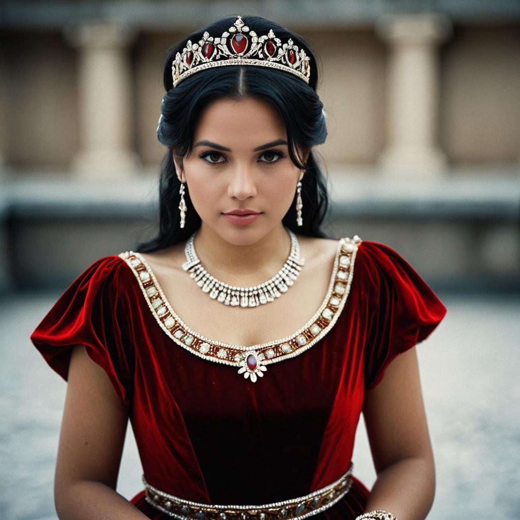 Portrait of a young woman wearing a Roman-style red velvet dress adorned with jewels. She has long black hair, brown eyes, and is accessorized with a jeweled tiara, matching necklace, earrings, and bracelet. The background is blurred, emphasizing her elegant costume and regal appearance.