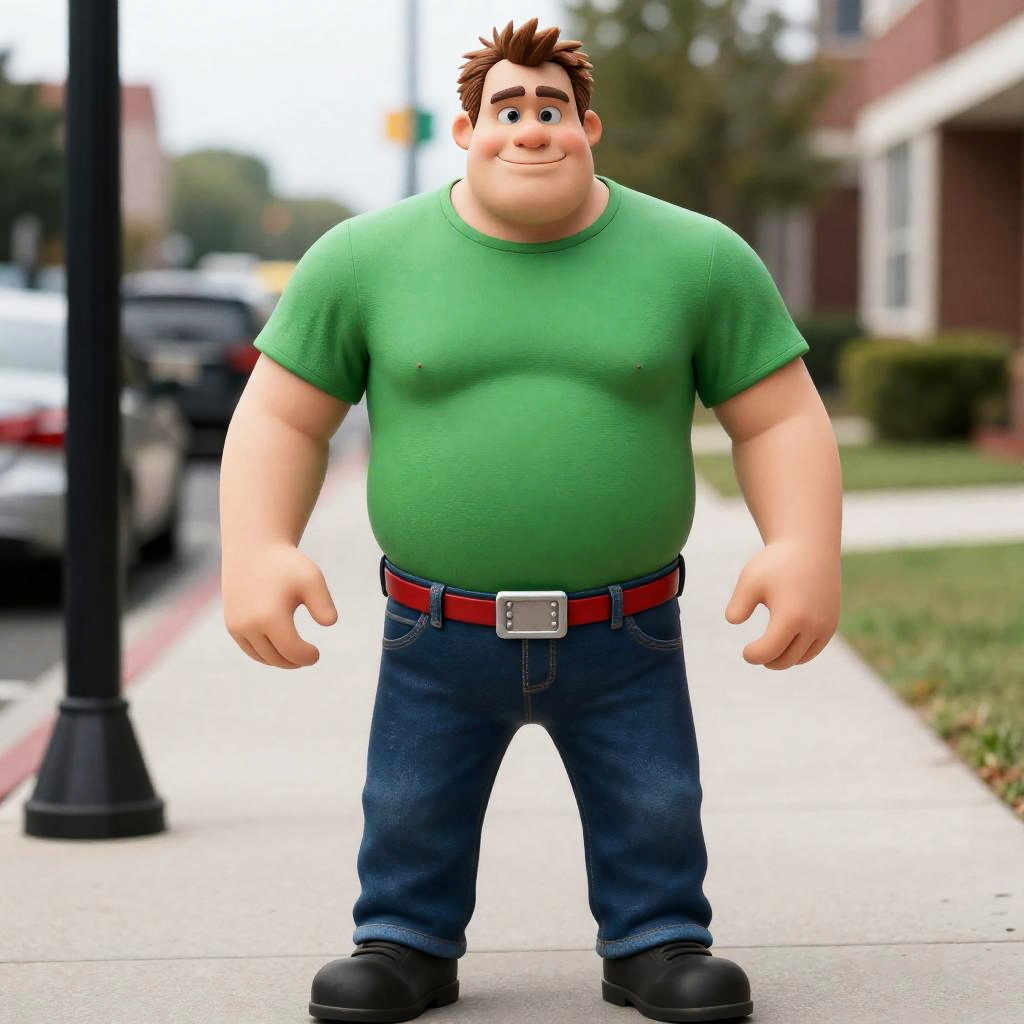 Small head big body cartoon superhero, muscular physique with tiny head, dramatic lighting, comic book style, action pose