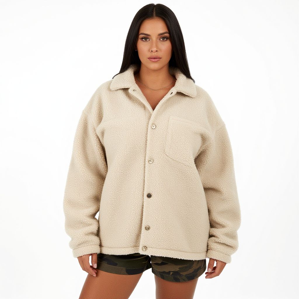 Portrait of a woman wearing a beige sherpa fleece jacket with a button-up front and shirt collar, paired with green and brown camo print shorts against a plain white background. The jacket has a relaxed fit and front pockets. The woman has long dark hair, a pretty face with beautiful eyes, and a confident expression.