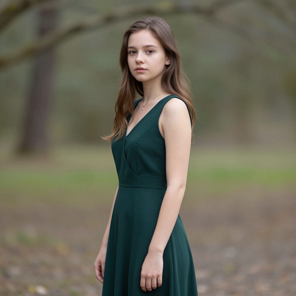 Photograph of a young woman standing in a blurred, forested background. She has light skin, long brown hair, and is wearing a sleeveless, dark green dress with a V-neck. Her expression is neutral, and she gazes slightly to the right of the camera. The background features out-of-focus trees and greenery, suggesting an early autumn setting. The soft light creates a gentle, natural ambiance. Her right arm is relaxed by her side, and she wears a simple necklace. The overall composition highlights her as the central subject against the muted, natural backdrop.