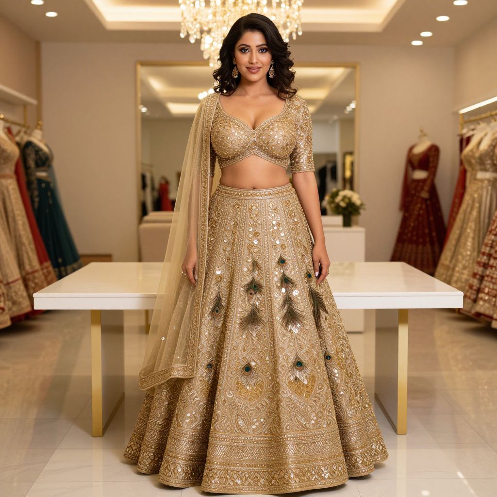 A luxurious South Indian bridal lehenga costume displayed on a white marble table in a modern wedding showroom, featuring a wide sari-style silhouette with golden mirror work and peacock feather detailing, the model a radiant woman with soft brown skin, large expressive eyes, and a warm smile, illuminated by soft golden light. The woman has big tits and cute face