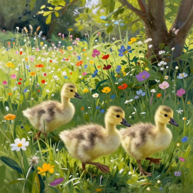 Gander and goslings walking through a lush meadow filled with wildflowers, bright and colorful scene, sunbeam filtering through trees, detailed natural environment, soft fluffy feathers visible, impressionistic style with vibrant tones.