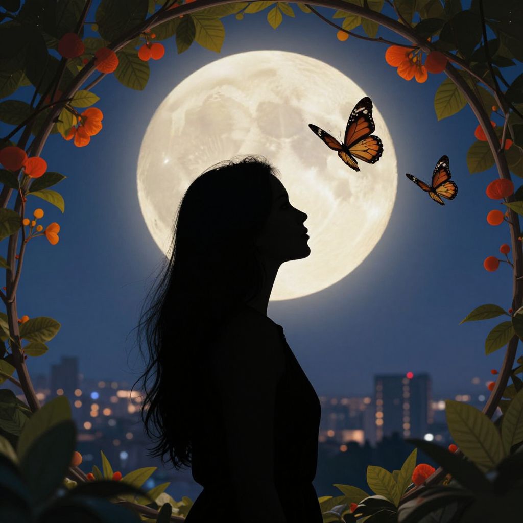 Silhouette of a woman gazing serenely as two butterflies flutter gracefully against a radiant full moon backdrop, framed by vibrant foliage and a distant cityscape.