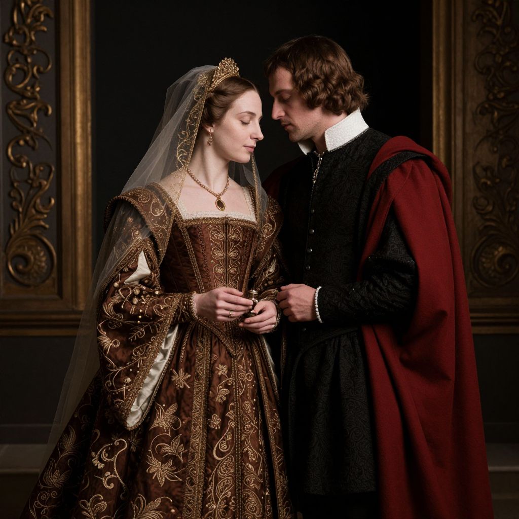 Elegant Renaissance attire adorns a couple in a solemn embrace, with the woman in a richly embroidered brown gown and veil holding a small object, while the man stands beside her in a dark vest and red cloak, set against a dark background with ornate architectural details.