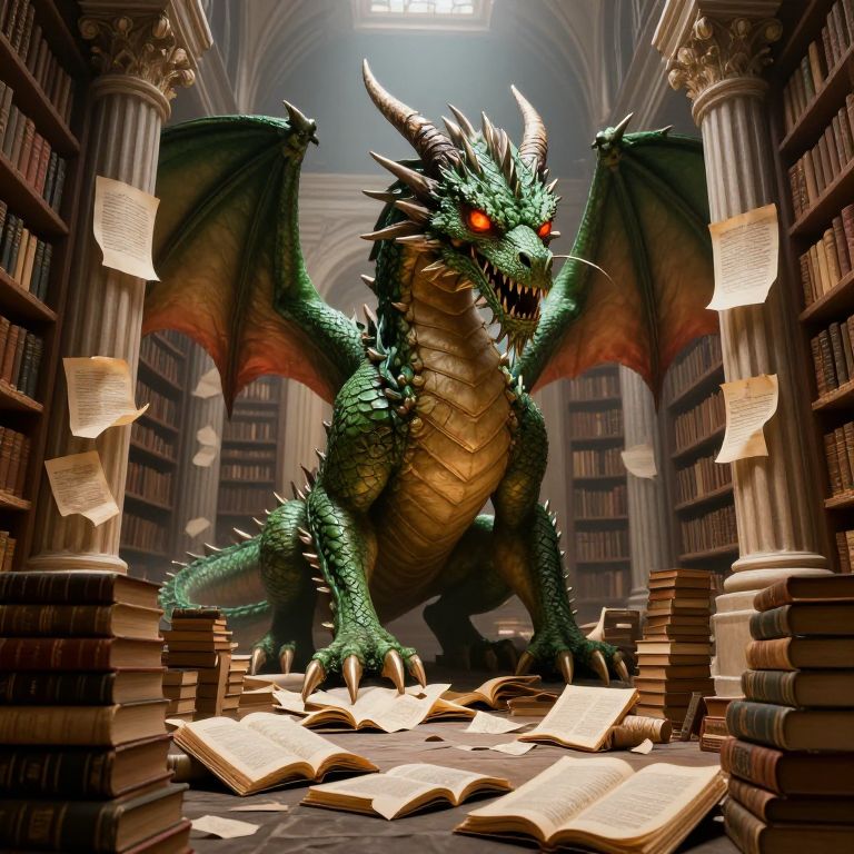 A colossal green dragon with fiery orange eyes and spiked horns dominates a grand library, its massive form surrounded by stacks of ancient books, its body seamlessly integrated with towering columns of parchment that spill open scrolls of knowledge across the stone floor.