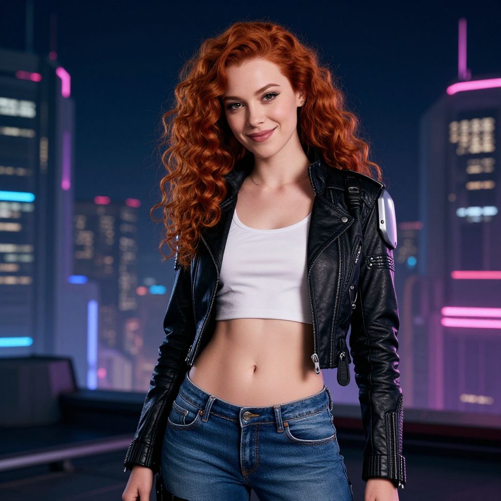 (JudithHoagTMNTApril:1.1), a high resolution RAW photo of a young beautiful JudithHoagTMNTApril woman with long curly red hair, cyberpunk hairstyle, wearing a cyberpunk style black leather jacket and white shirt and denim jeans, sexy standing pose, on a futuristic cyberpunk city rooftop at night, cyberpunk city with neon lights and futuristic buildings, smiling and looking at the viewer, (thin torso, slender, flat chest, smallest breasts, slender build), sexy portrait, photorealism, photorealistic