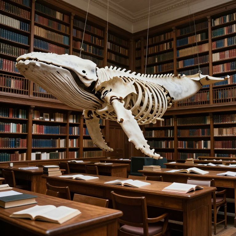 Photograph of a library with wooden bookshelves filled with multicolored books on all walls. A large white whale skeleton sculpture, suspended by wires, hangs centrally over the room. The sculpture is highly detailed, showing bone structure and fins. Below, wooden desks with open books and chairs are neatly arranged in rows. The room is well-lit, highlighting the contrast between the dark wood and the white skeleton. The library has a classic, scholarly ambiance, with ornate ceiling moldings adding to the historical feel.