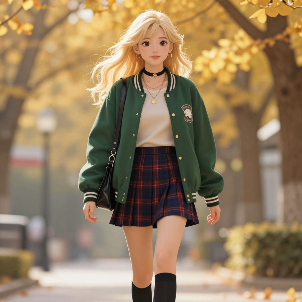 The image depicts a stylish young woman walking outdoors, framed by a warm, autumnal background with golden leaves and sunlight filtering through trees, She has long, flowing blonde hair, and is dressed in a fashionable ensemble, She wears a green varsity jacket over a beige top, paired with a short, pleated plaid skirt in shades of dark blue and red, Her accessories include a black choker with a gold pendant, hoop earrings, and layered necklaces, Knee-high black socks and a black leather bag slung over her shoulder complete the look, The art style is highly detailed and polished, resembling anime-inspired or semi-realistic digital painting, with soft shading and warm, glowing colors that enhance the autumn vibe of the scene, The background elements like trees and buildings are subtly blurred to keep the focus on the character