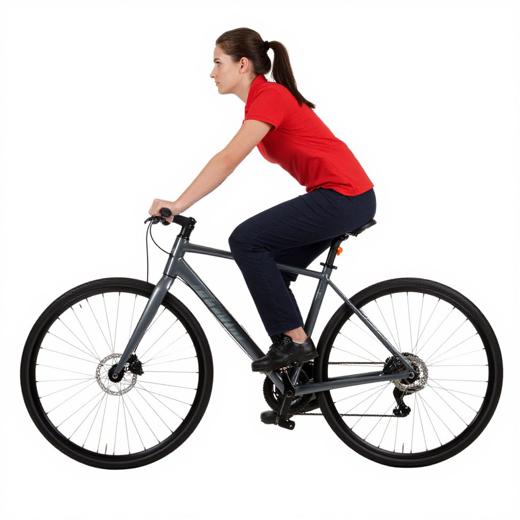 Woman riding a sleek gray bicycle with black tires and pedals, wearing a vibrant red shirt and dark pants, captured in a side profile against a clean white background.