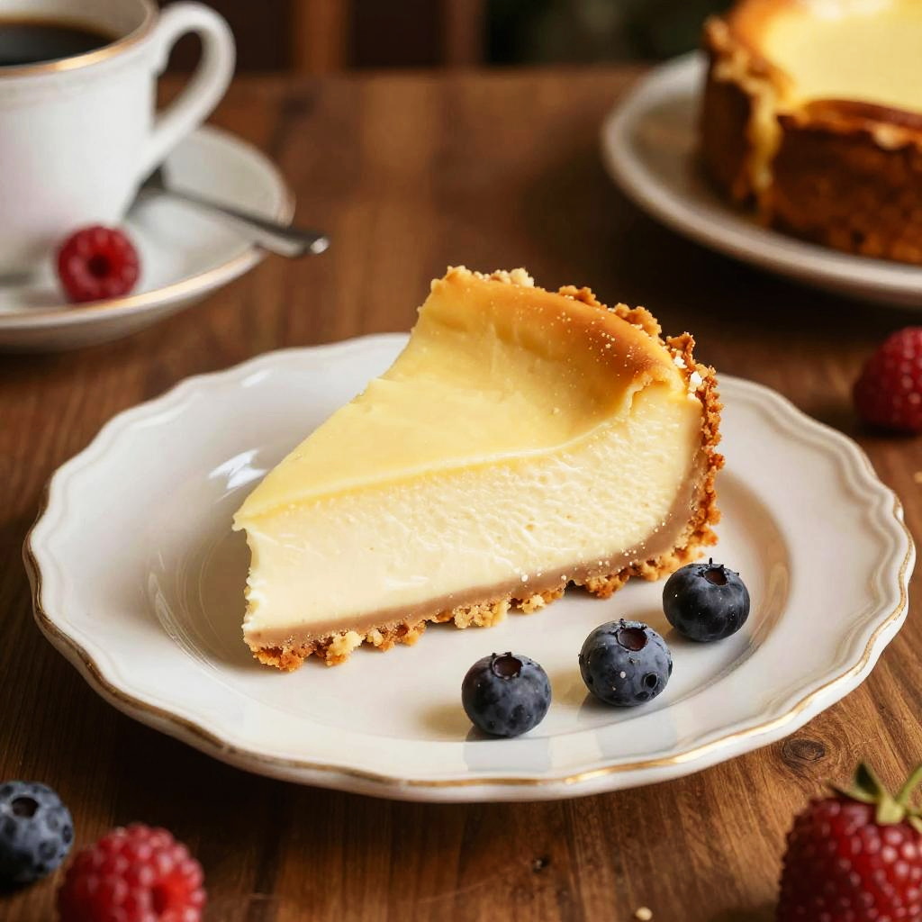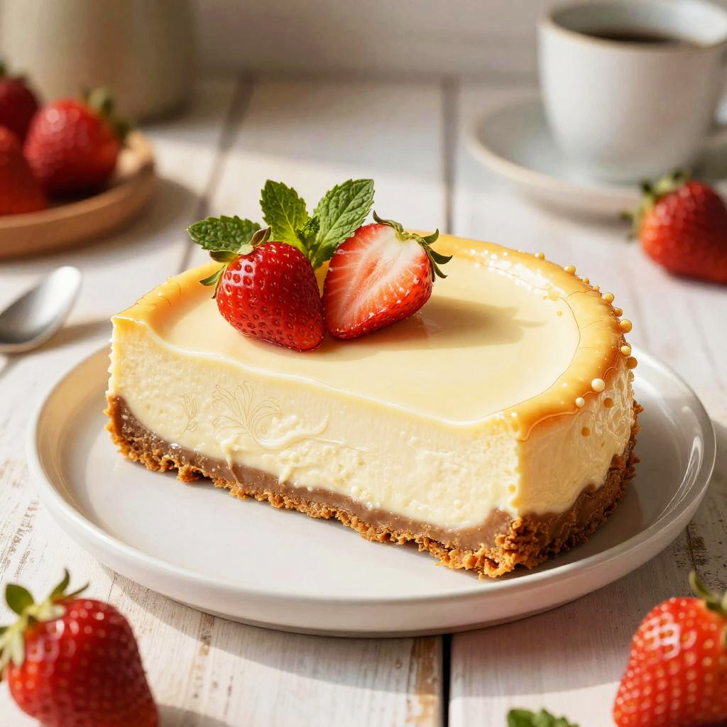Cheesecake rendered through Frank Cho's signature style emphasizing strong yet delicate lines, vibrant colors highlighting the dessert's velvety smoothness, ornate garnishes of ripe strawberries and mint leaves, set against the backdrop of a sunlit rustic kitchen table.