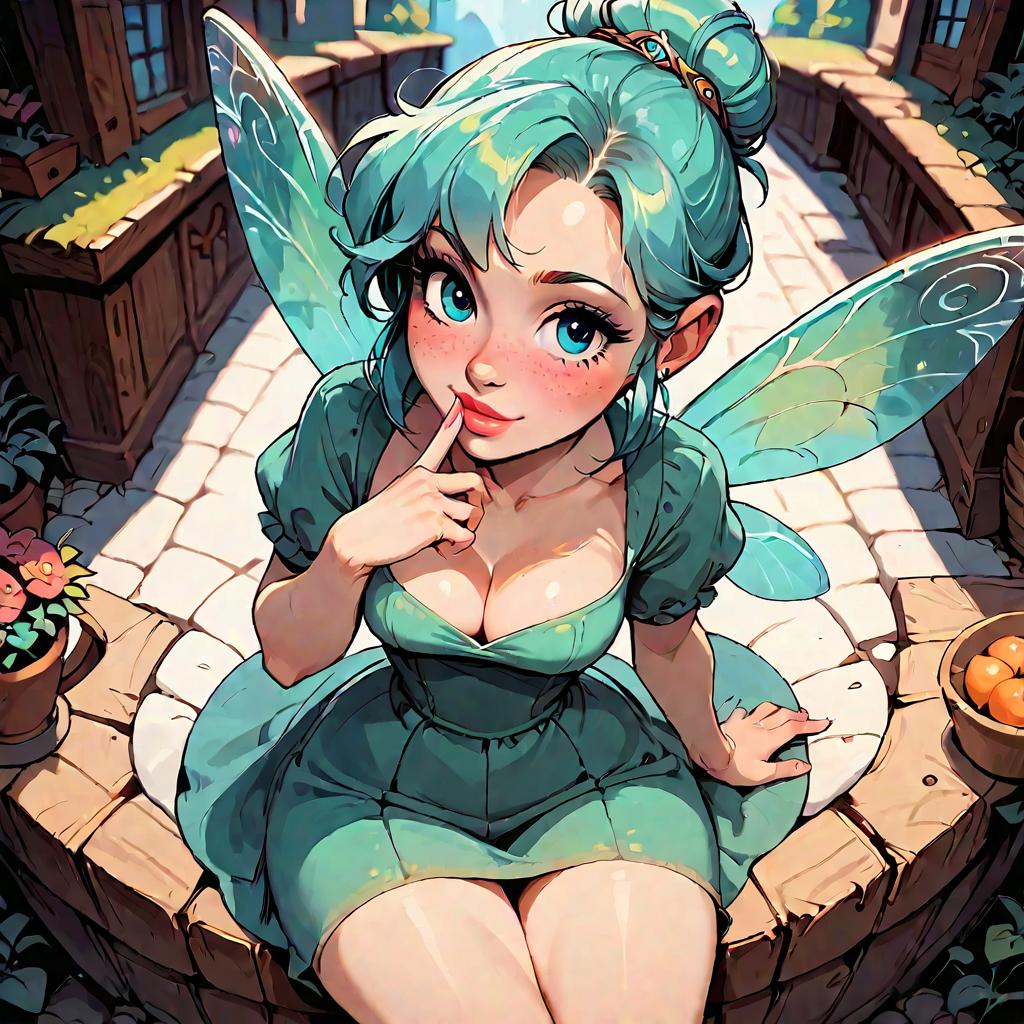 Score_9, score_8_up, score_7_up, score_6_up, girl, fairy wings, blue eyes, green dress, sexy, hair bun, curvy, medium breasts, narrow waist, wide hips, thick thighs, looking at viewer, dynamic angle, cowboy shot, cute, cartoon, dynamic pose, from above, sfw, village, happy, cleavage, sitting, finger to mouth