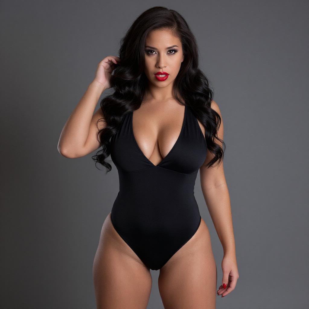Photograph of a young woman with long, straight black hair and light brown skin. She has full eyebrows, dark eyes, and glossy pink lips. She wears a black, strapless bandeau top with a keyhole cutout revealing her small to medium-sized breasts. Her toned midriff and arms showcase multiple intricate tattoos. She has a navel piercing. The background is solid black, emphasizing her figure. The lighting highlights her smooth skin and the details of her tattoos. Her expression is neutral, gazing slightly to the left.