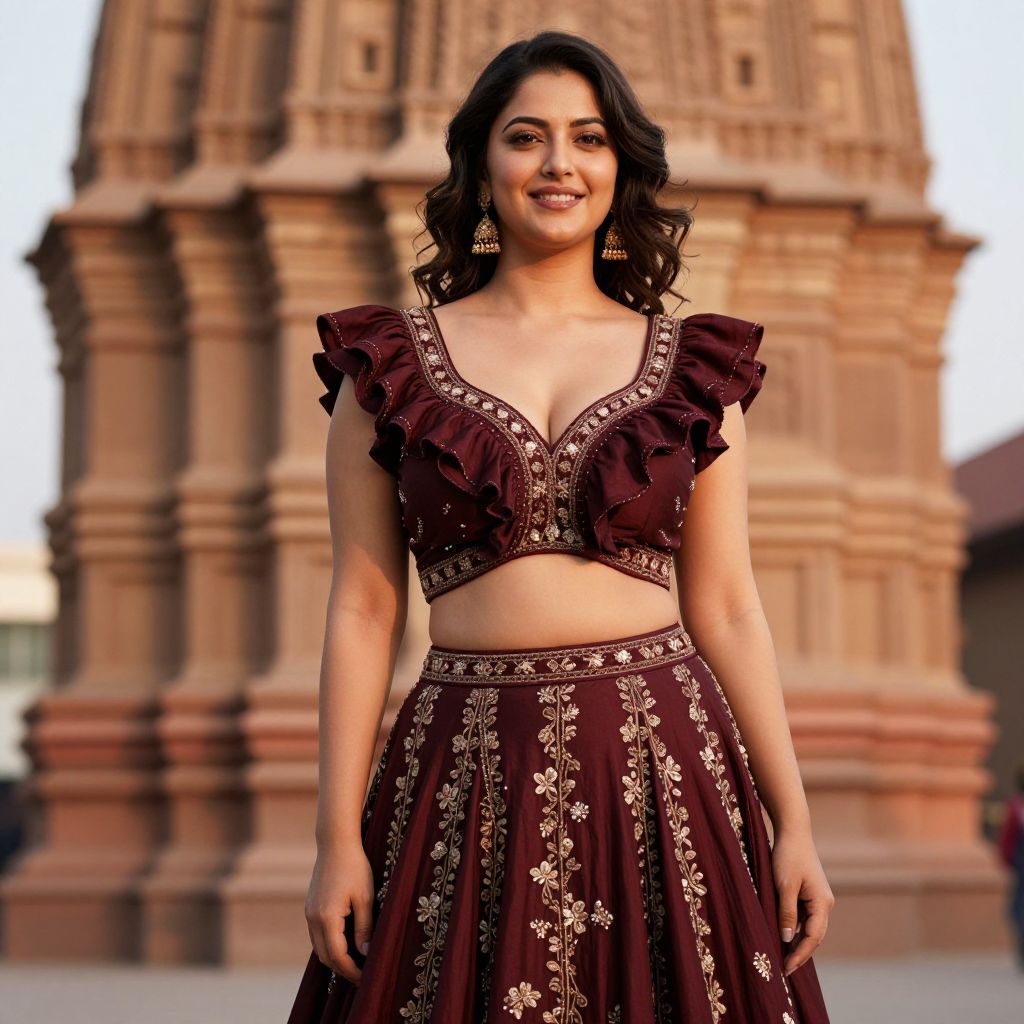 A strong, confident woman with dark wavy hair and a warm smile, wearing a designer ruffle lehenga in rich maroon with intricate hand-embroidered ruffles, standing in front of a heritage temple at golden hour with soft shadows and warm lighting emphasizing the texture of fabric.. The woman has big breasts and cute face