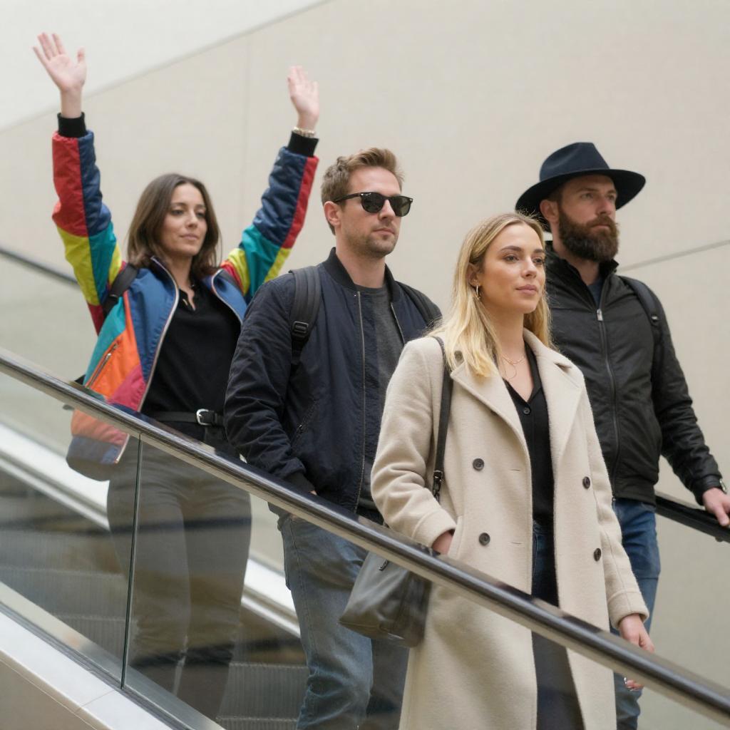 Photograph of four people on an airport escalator. Woman on left raises arms, wearing colorful jacket. Man in center wears sunglasses, dark jacket. Blonde woman in beige coat stands next to him. Bearded man in black jacket and hat walks behind. Glass and metal escalator, beige walls. Bright lighting. Casual attire.