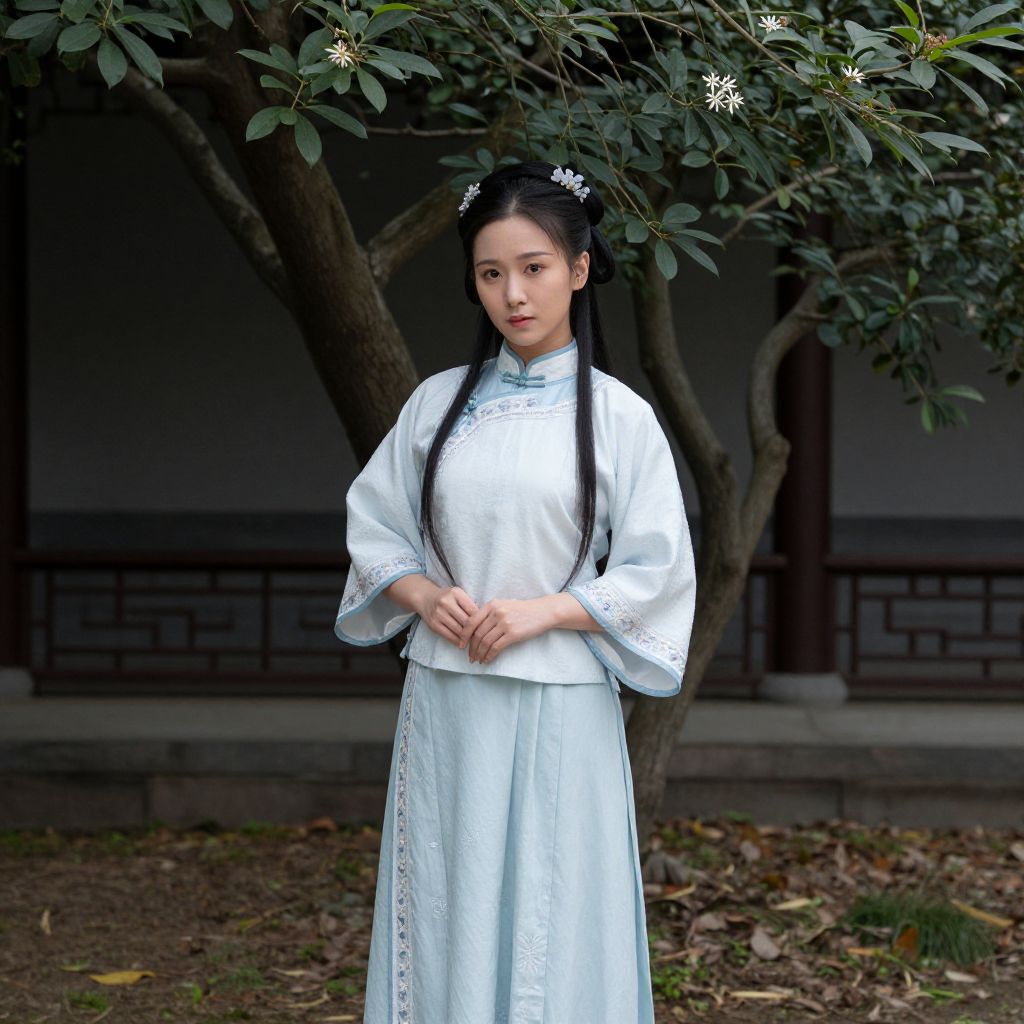 Spring Awakening Costume, woman in a traditional chinese dress standing in front of a tree