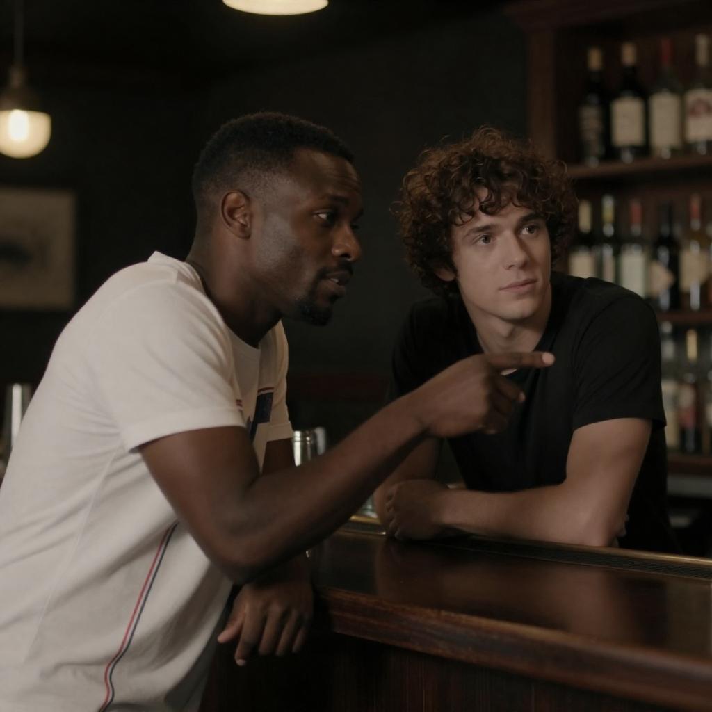 Photograph of two men in a dimly lit bar. One man with dark skin, short hair, and white shirt with red and black stripes leans forward, pointing. Other man with light skin, curly hair, and black shirt looks at him intently. Bar counter with bottles in background.