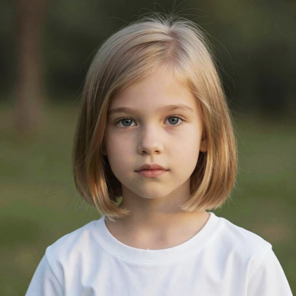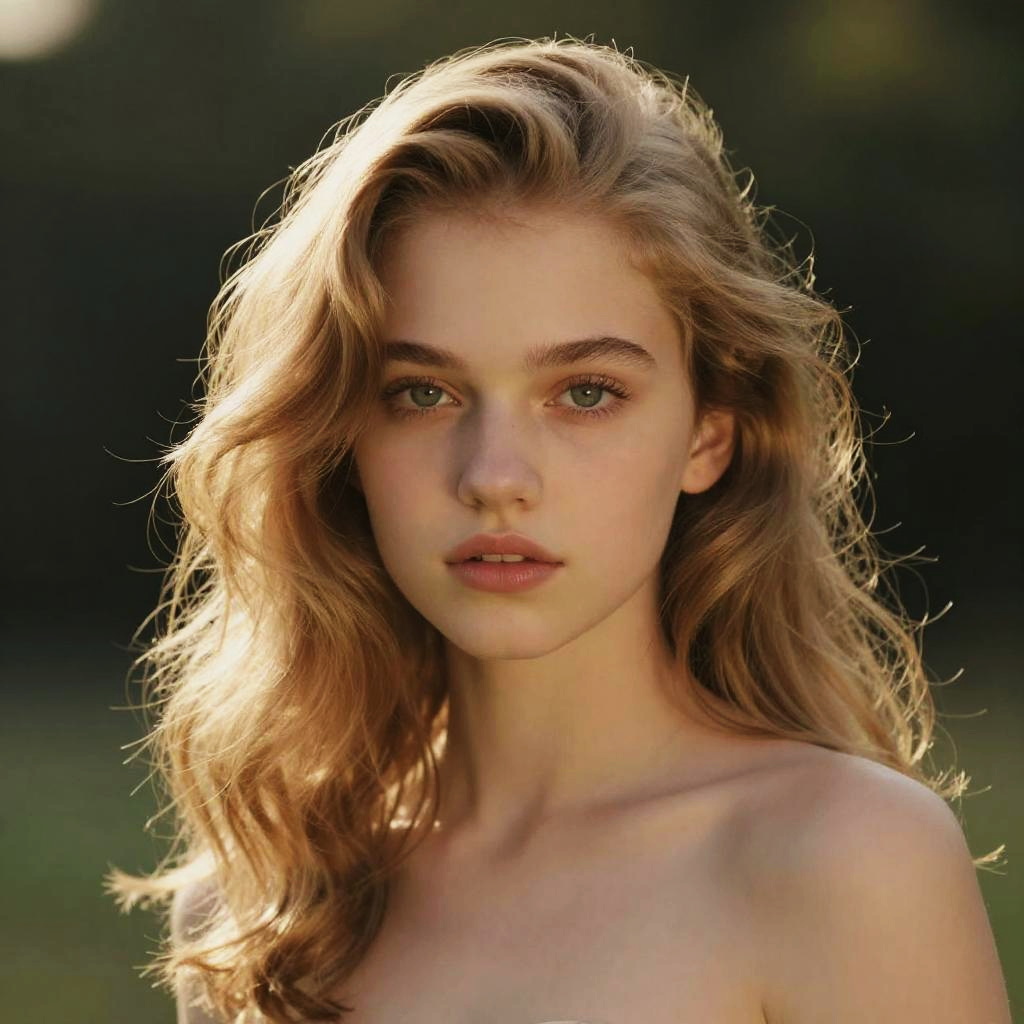 Hyper-realistic portrait of a gorgeous young lady with warm hazel, her sleek straight dark brown hair cascading gracefully over her shoulders in soft evening lighting.
