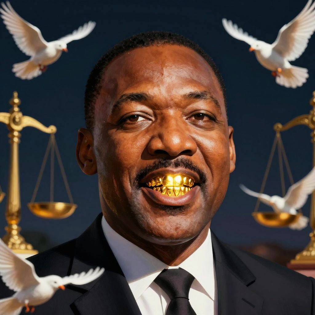 Photograph of a smiling Black man with glowing gold teeth, wearing a black suit and white shirt, surrounded by white doves and golden scales of justice