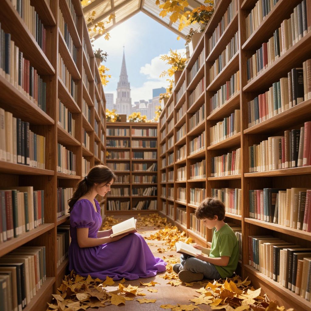 A digital illustration depicts a cozy library aisle with wooden bookshelves filled with books on both sides. A young woman with long brown hair, wearing a purple dress, sits on the left, reading a book. On the right, a young boy with brown hair, dressed in a green shirt and blue jeans, also reads a book. Both are surrounded by fallen autumn leaves on the floor. Sunlight filters through the library's roof, casting a warm glow and highlighting yellow leaves. In the background, a church steeple is visible through a window, adding a serene, academic atmosphere.