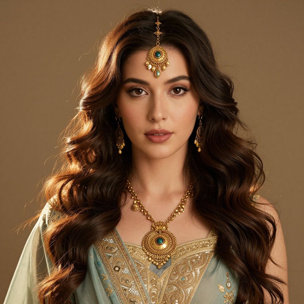 Photograph of a beautiful South Asian woman with long, wavy dark brown hair. She wears traditional gold jewelry, including a forehead ornament, chandelier earrings, and a large, intricate necklace with a central green gem. Her attire is a light green, gold-embroidered traditional dress. The background is a plain, warm brown, highlighting her elegant features and the rich textures of her clothing and jewelry. Her expression is calm and confident, with subtle makeup enhancing her natural beauty. The lighting creates a soft, warm glow around her hair, adding to the overall regal appearance.