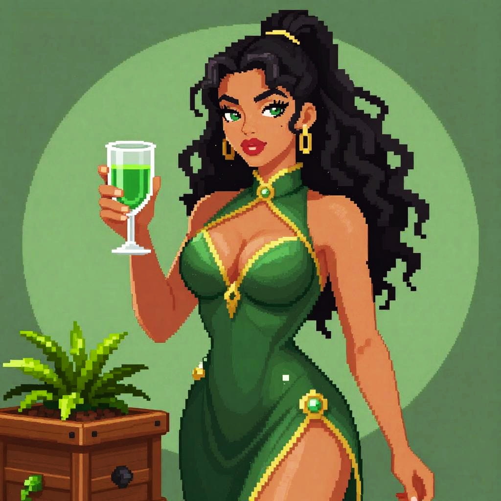 Pixel art of a curvy, dark-skinned woman with long black hair, green dress, gold accents, holding a green drink, beside a p