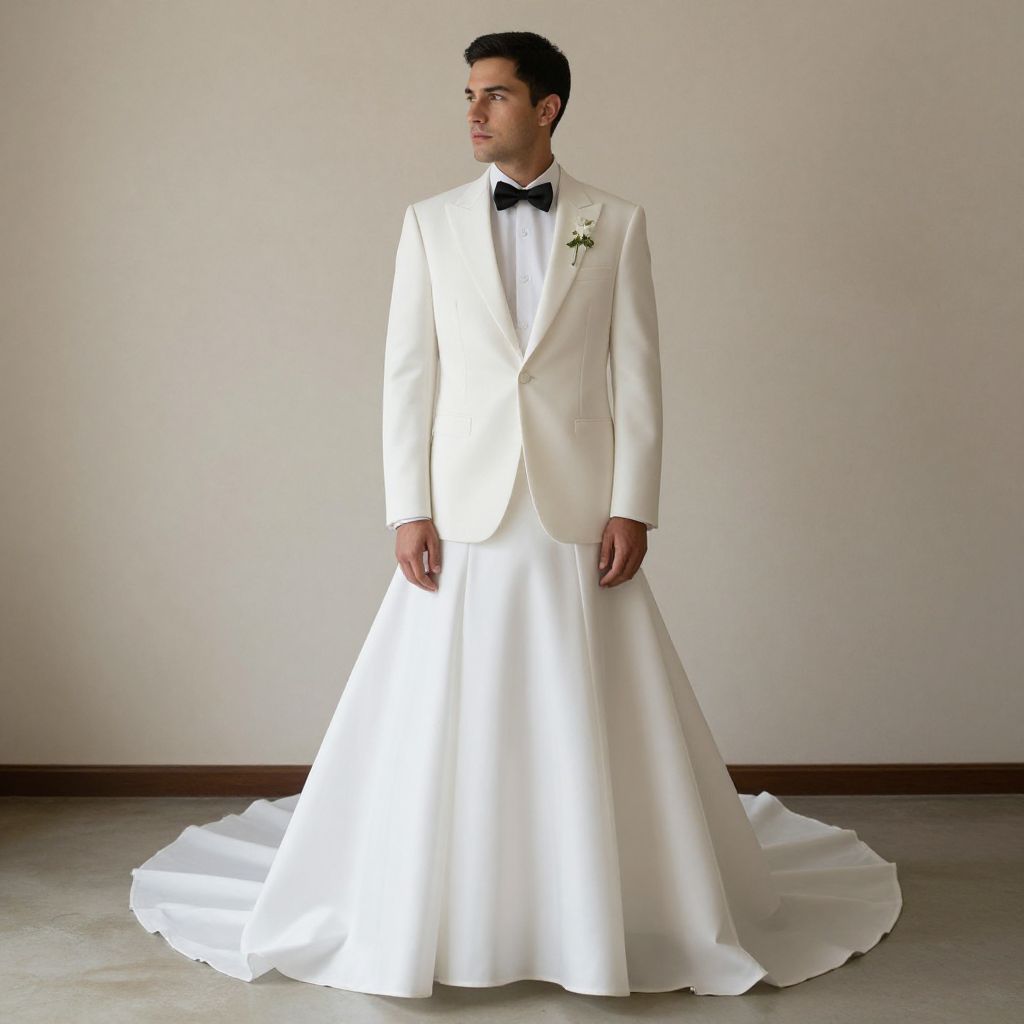 "Wedding Gown Groom, man in a white suit and black bow tie standing in front of a wall"