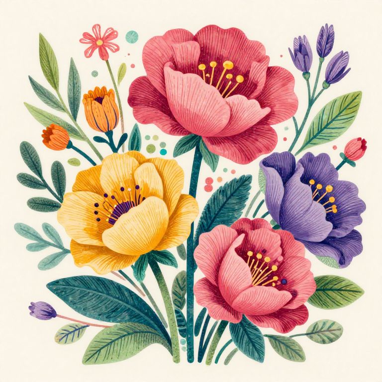 A hyper-detailed digital illustration of a vibrant bouquet featuring large pink, yellow, and purple flowers with detailed petals and stamens, accompanied by smaller buds and green leaves. The artwork showcases subtle textures and patterns in a chromolithography style with vivid colors and an artistic fantasy design.