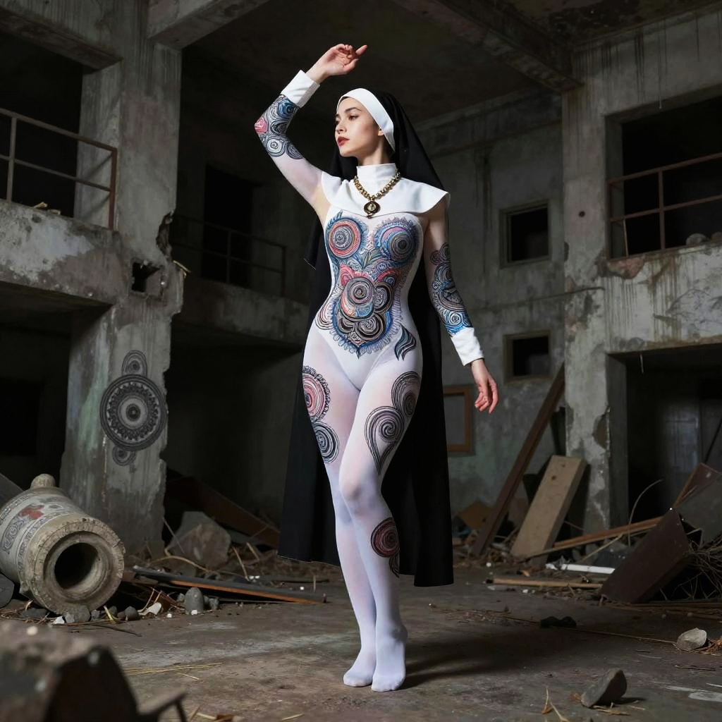 Photorealistic image of a young woman dressed as a nun wearing a form-fitting bodysuit with intricate colorful zentangle patterns. She stands in a ruined, brutalist-style building with dark, shadowy surroundings. The woman wears a traditional nun's headpiece and a gold necklace, striking a graceful, poised stance. The image combines elements of fine art, surrealism, and urban decay with a vibrant color palette and deep shadows.
