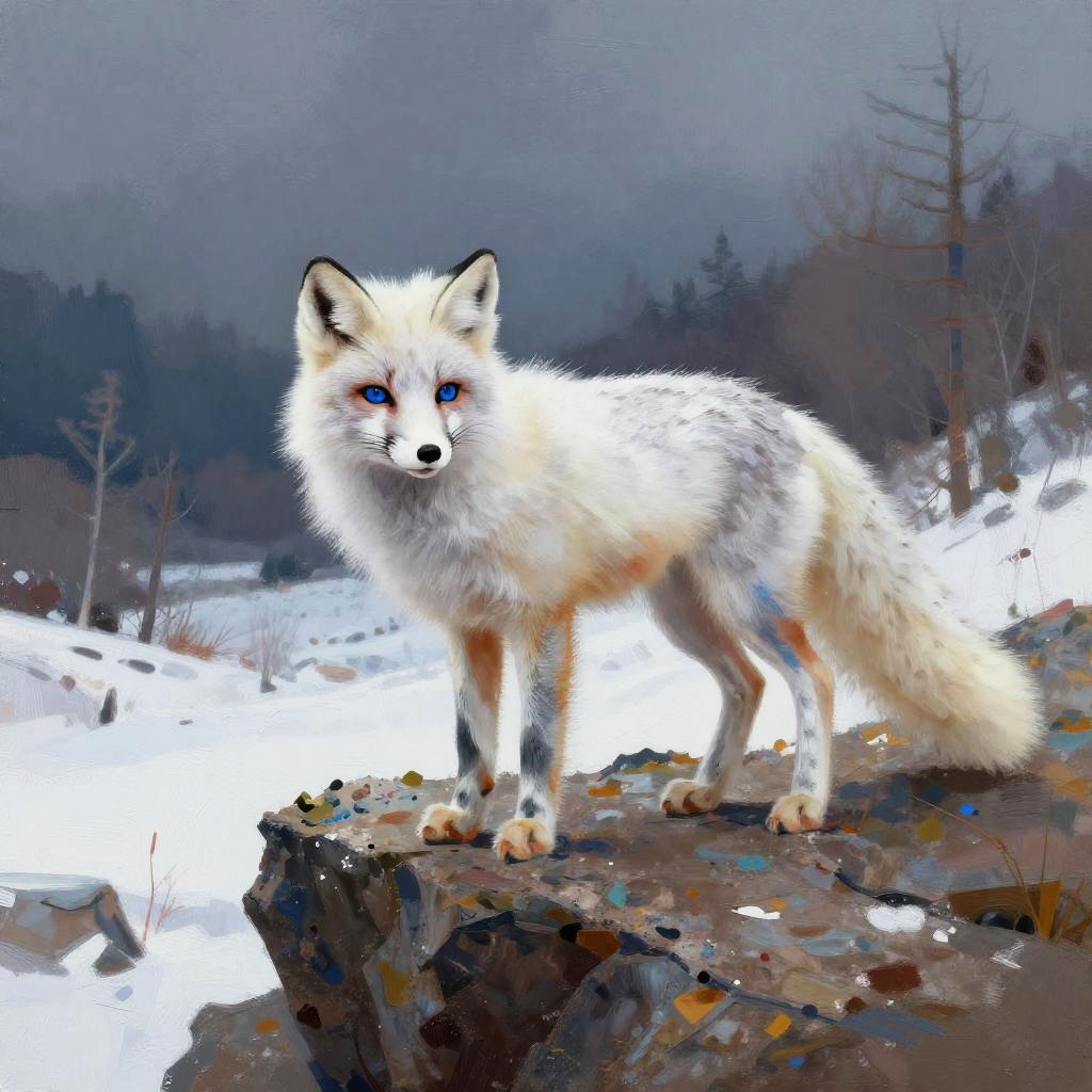 White fox with blue eyes standing on a rocky cliff overlooking a snowy valley, dramatic lighting, dynamic pose, impressionistic style, rich textures and vivid colors