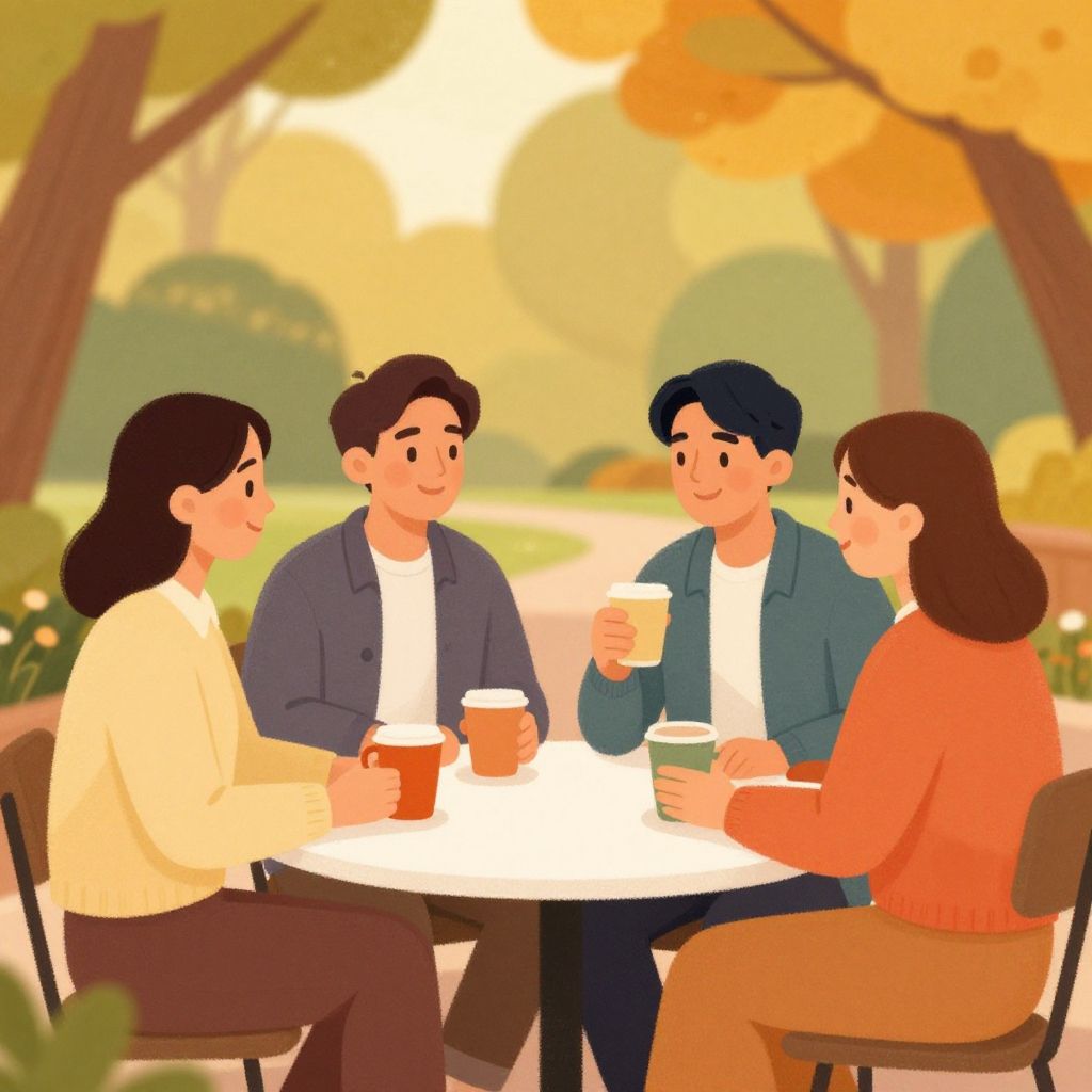 Hand drawn characters in a cozy coffee shop, textured pencil strokes, diverse group chatting and laughing, vintage style, warm lighting, detailed interior with plants and books