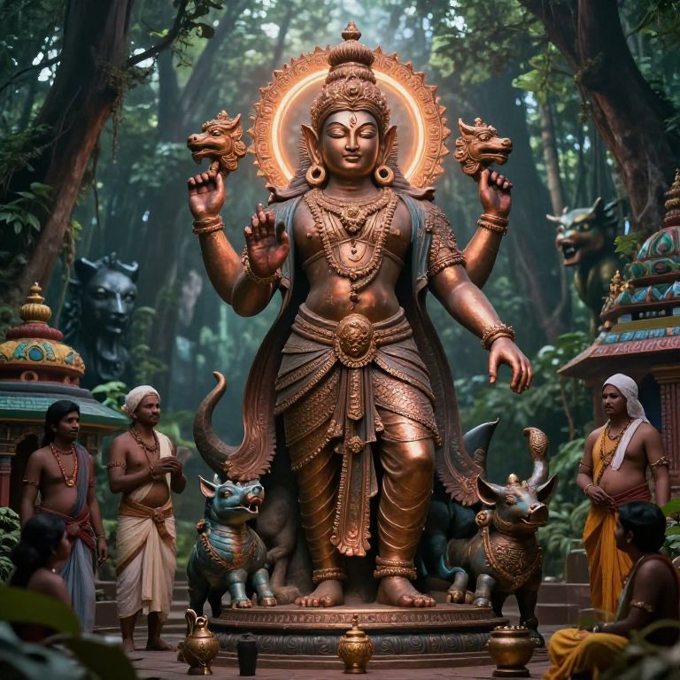 Photorealistic digital art of a golden Hindu deity statue with four arms, lion and bull motifs, surrounded by devotees in a lush forest temple setting