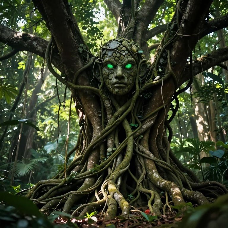 A mystical colossus figure made of intertwined vines and stones, seamlessly blending into a giant tree in an ancient forest. The colossus features glowing green eyes and is surrounded by dappled sunlight filtering through dense leaves, creating a serene and mystical atmosphere with a lush natural green palette.