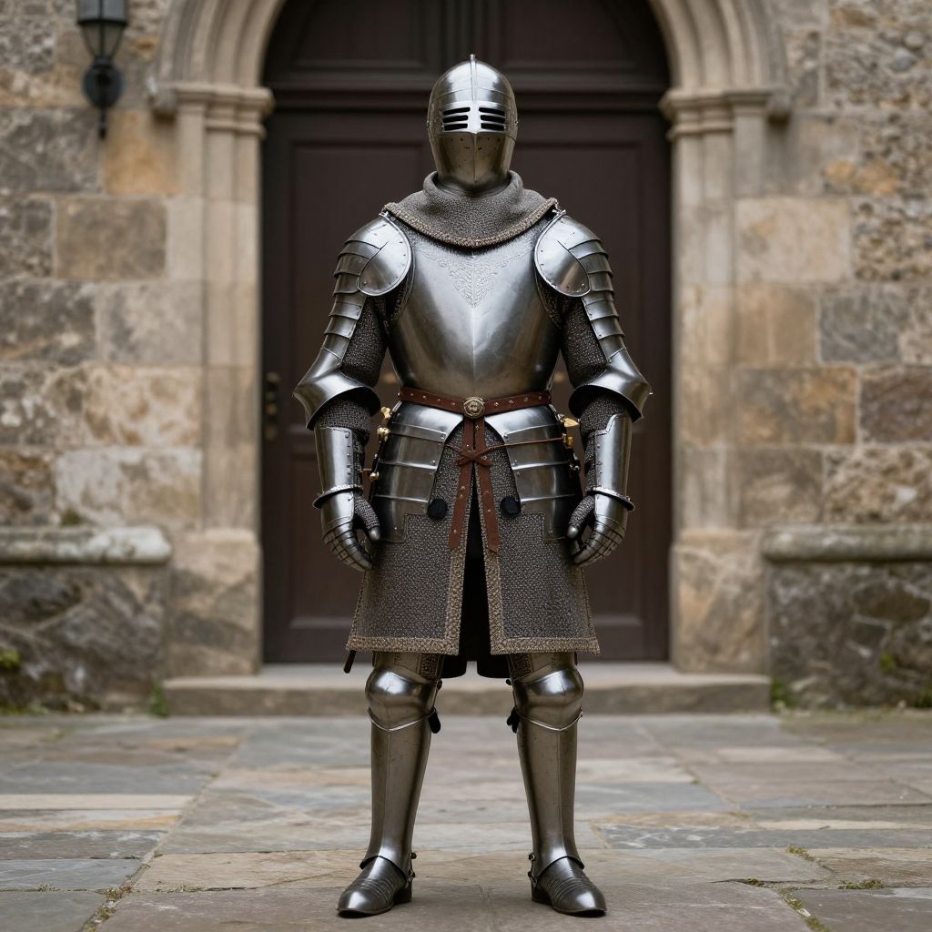 Photograph of a medieval knight standing in front of a stone archway with a dark wooden door. The knight is clad in shiny, silver steel plate armor, including a helmet with a closed visor, pauldrons, gauntlets, and greaves. He wears a chainmail tunic under the armor, fastened with a brown leather belt. The background features textured stone walls with a black lantern on the left. The knight stands on a cobblestone pavement, his posture upright and hands by his sides. The lighting is natural, highlighting the metallic sheen of his armor.