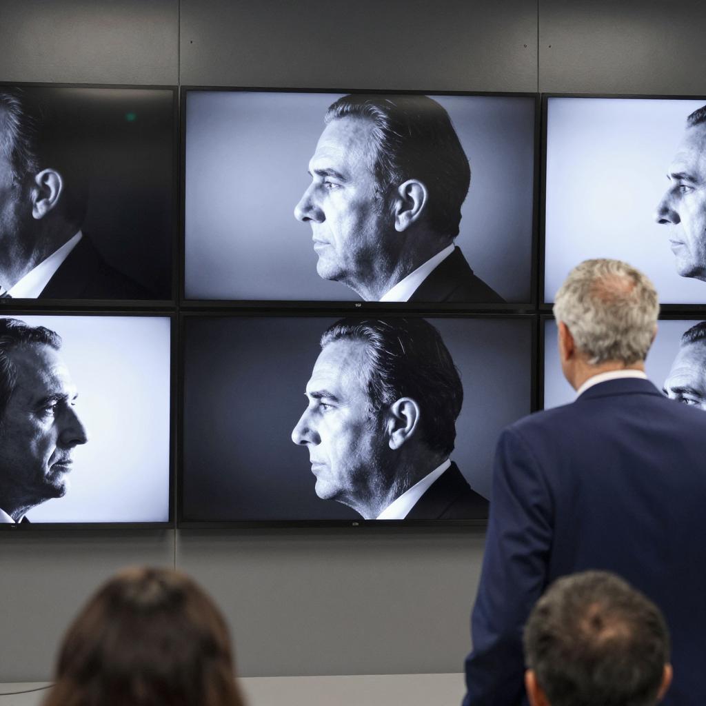A middle-aged man with a serious expression, wearing a gray wool coat and black fedora, standing in a dimly lit room. He is working on an old-fashioned printing press, with a black-and-white image of two faces in front of him. Background includes metal pipes, a clock, and multiple screens. His right hand holds a lever on the press.