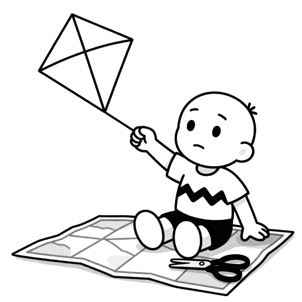 Cartoon of a bald boy with a neutral expression, building a triangle kite on a map with . He wears a shirt with zigzag pattern, sits on the map, with scissors nearby. Black and white drawing.