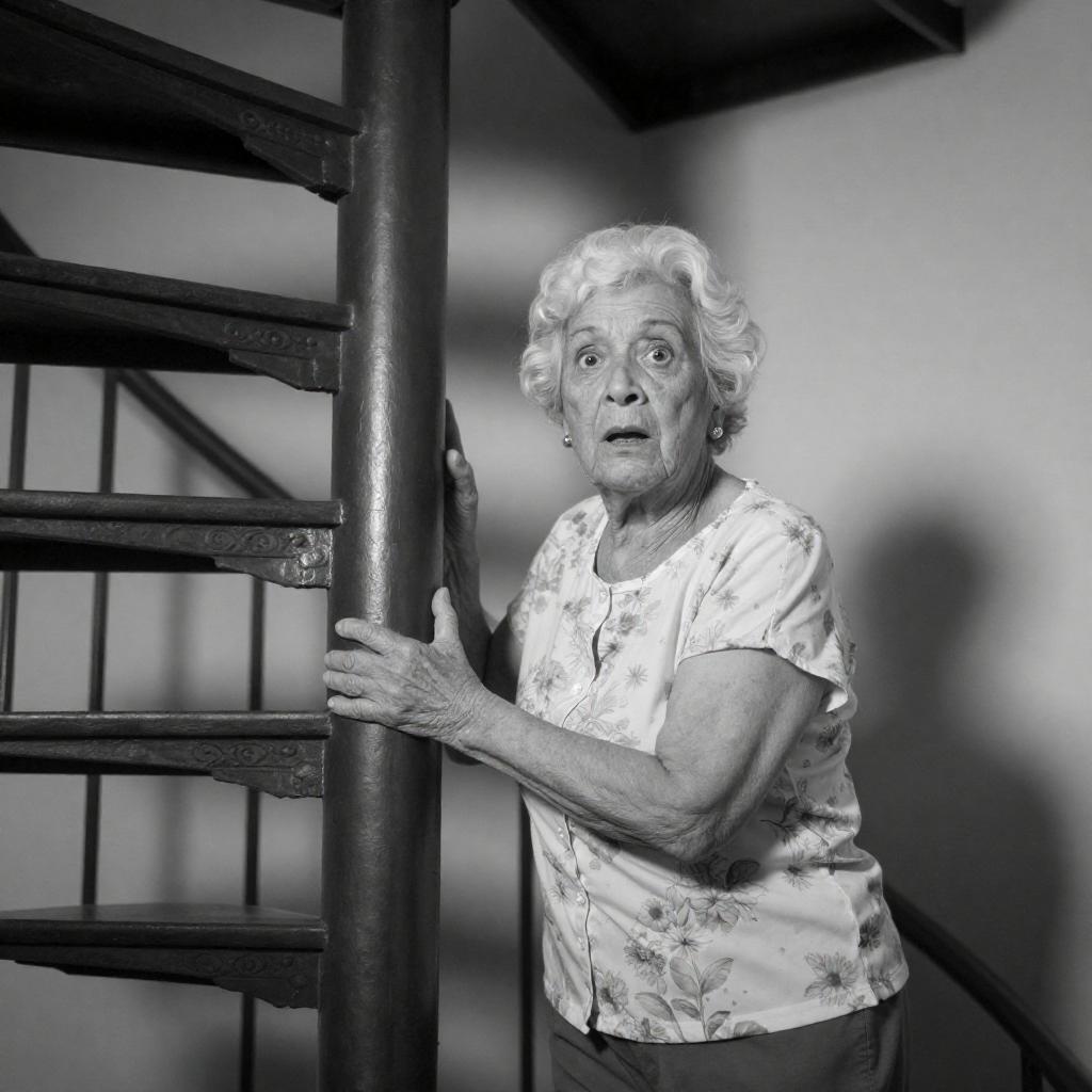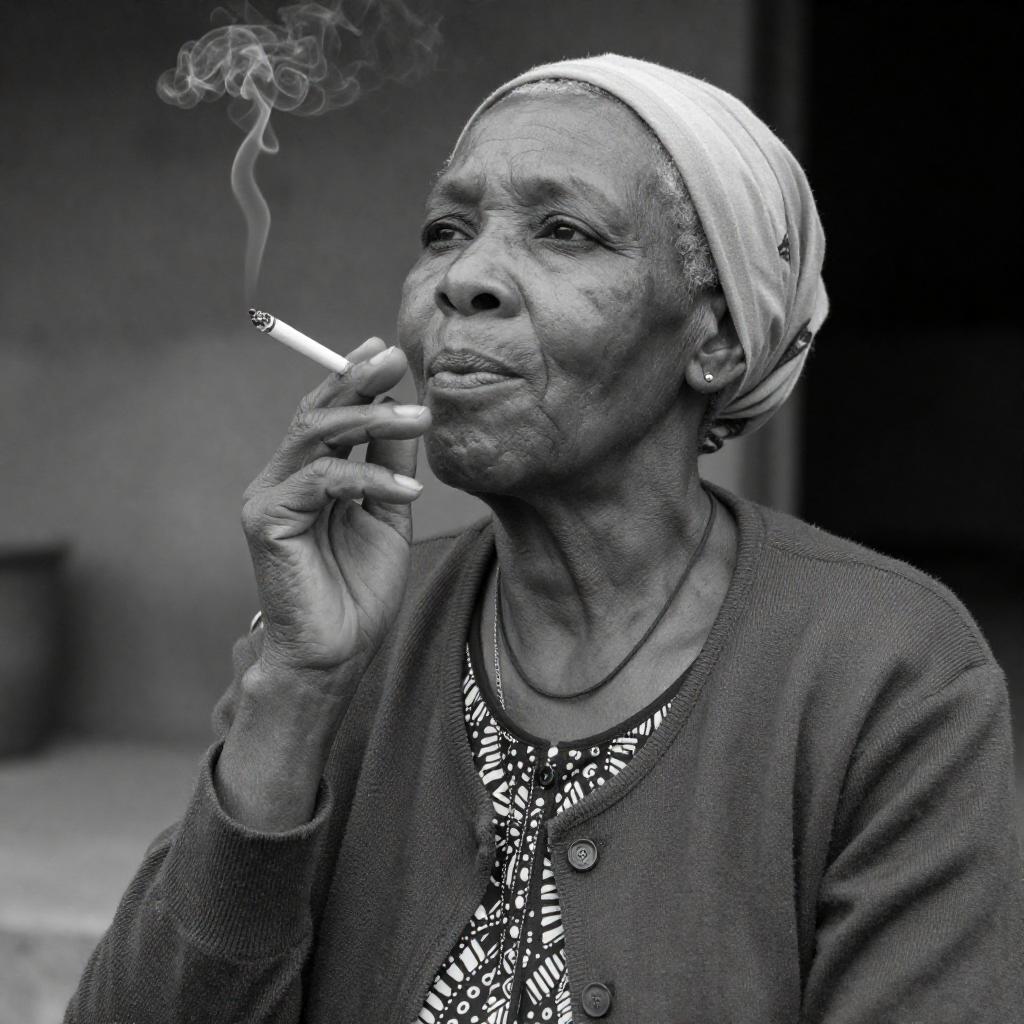 Black and white photograph of an older Black woman with a headscarf, holding a cigarette to her mouth. She wears a ured cardigan over a patterned top, with a necklace. She looks upward with a calm expression. Background is blurred. Smoke curls around her head.
