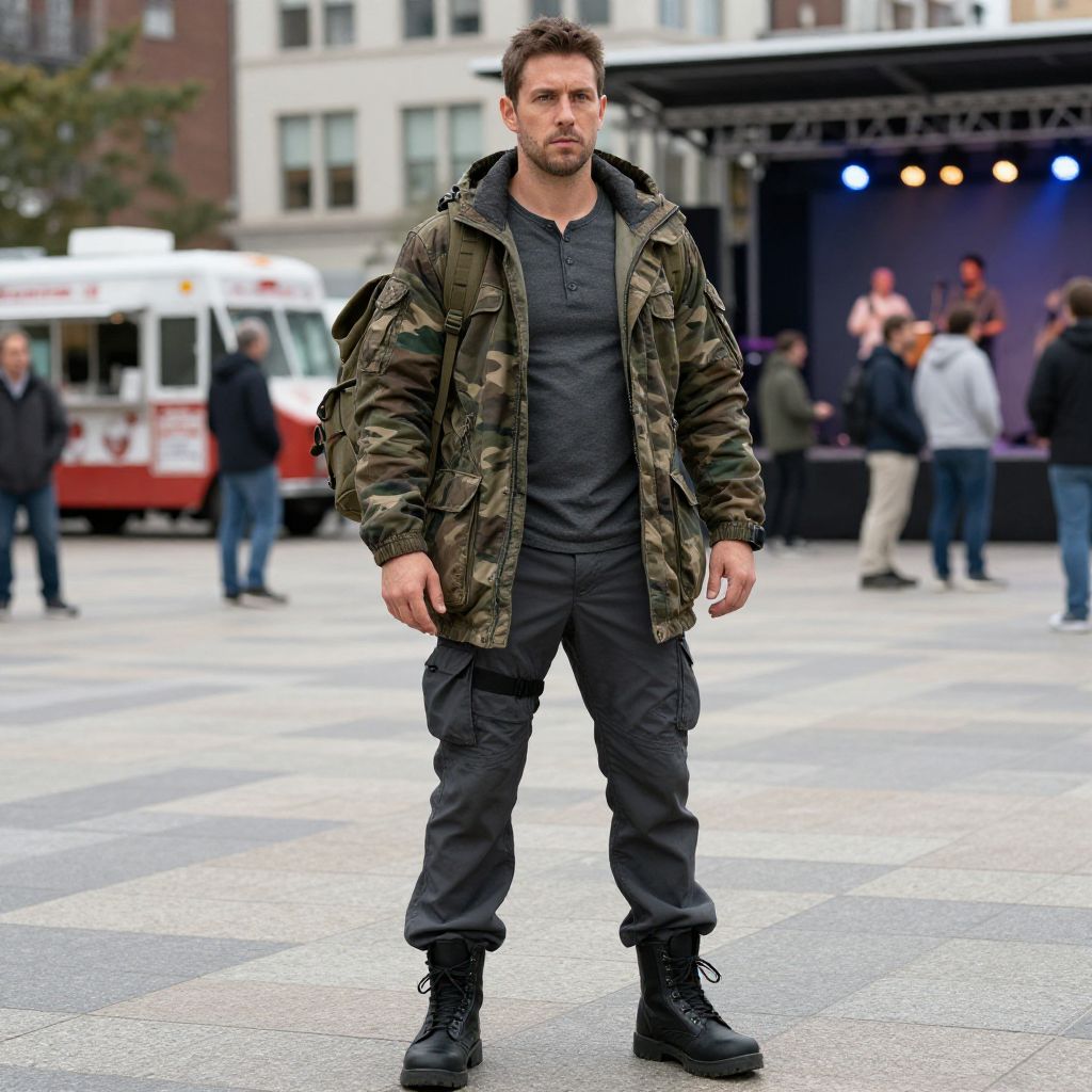 A man, camouflage parka, dark grey tactical pants, charcoal henley shirt, black combat boots, durable nylon backpack, urban plaza, food trucks, live music stage, Cibachrome style, focused expression, ready for adventure. Man has masculine face and piercing eyes