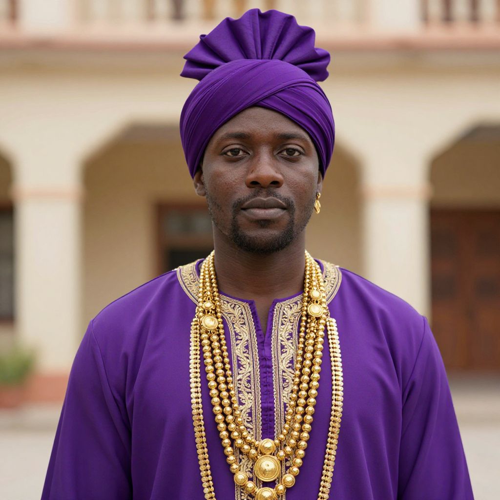 Photograph of a dark-skinned African man with a serious expression, wearing a rich purple headwrap and matching long-sleeve shirt adorned with intricate gold embroidery and multiple gold necklaces. His shirt has a high collar with gold detailing. He has a short beard and wears a single gold earring. The background features a blurred, beige-colored building with arched windows and brown doors, suggesting an outdoor setting. The overall composition highlights his regal attire and cultural heritage. The image has a vivid, slightly saturated color palette.