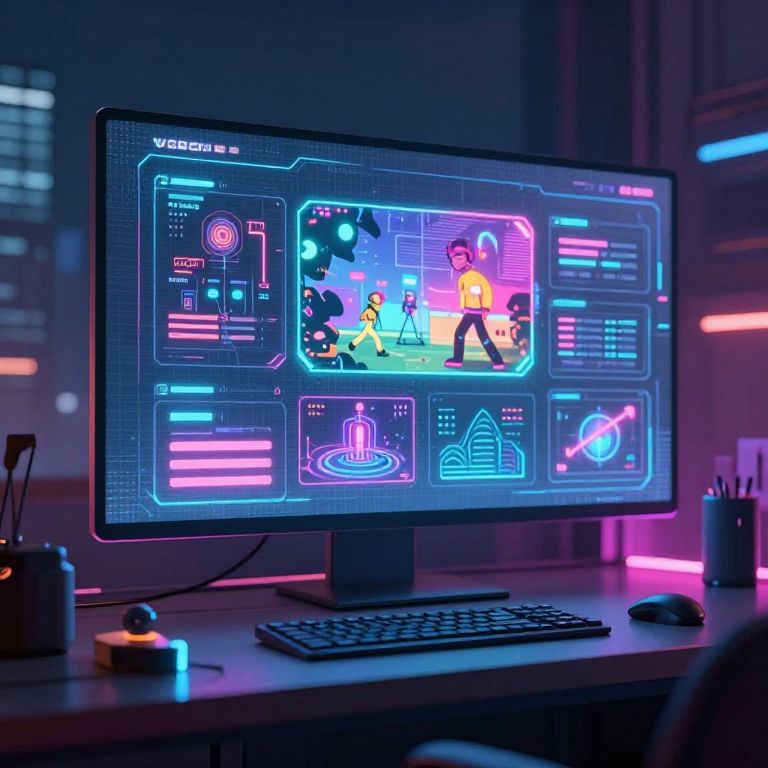 2d game idea generator, futuristic cyberpunk theme with neon glowing elements, holographic screens displaying game concepts, sleek minimal user interface, moody cityscape background, vibrant color palette, cinematic lighting, creative energy in digital workspace