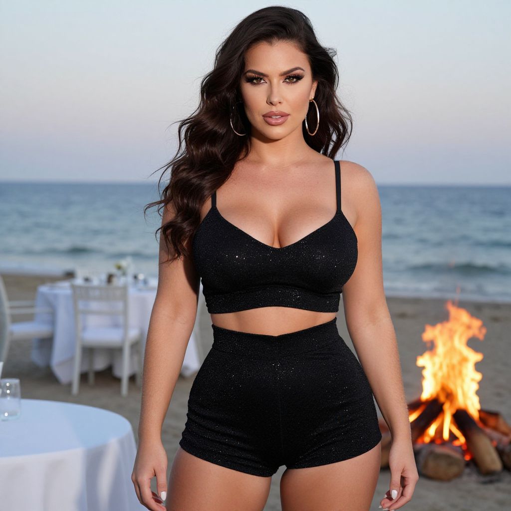 Photograph of a beautiful woman with long, wavy dark brown hair standing on a beach at sunset. She has tan skin, full lips with pink lipstick, and dark, well-defined eyebrows. She is wearing a sparkling black crop top with thin straps and high-waisted black shorts, highlighting her curvy physique and large breasts. She has large hoop earrings. In the background, there are white round tables with chairs, and a small fire burning on the sandy ground. The ocean and sky are visible, with the horizon blending into the soft evening light.