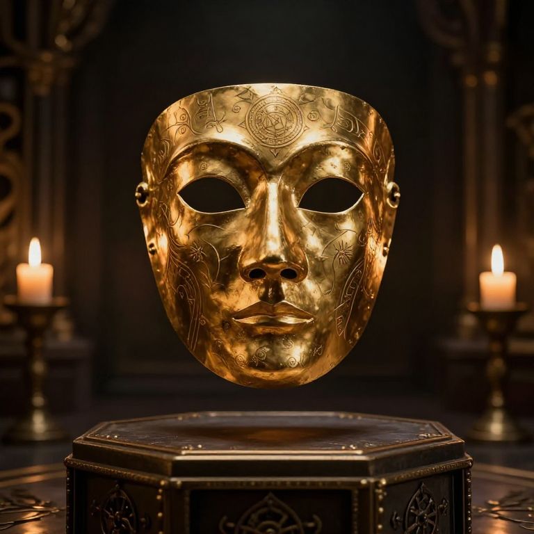 Photograph of a golden, ornate masquerade mask with intricate patterns, illuminated by candlelight, centered on a hexagonal pedestal in a dim