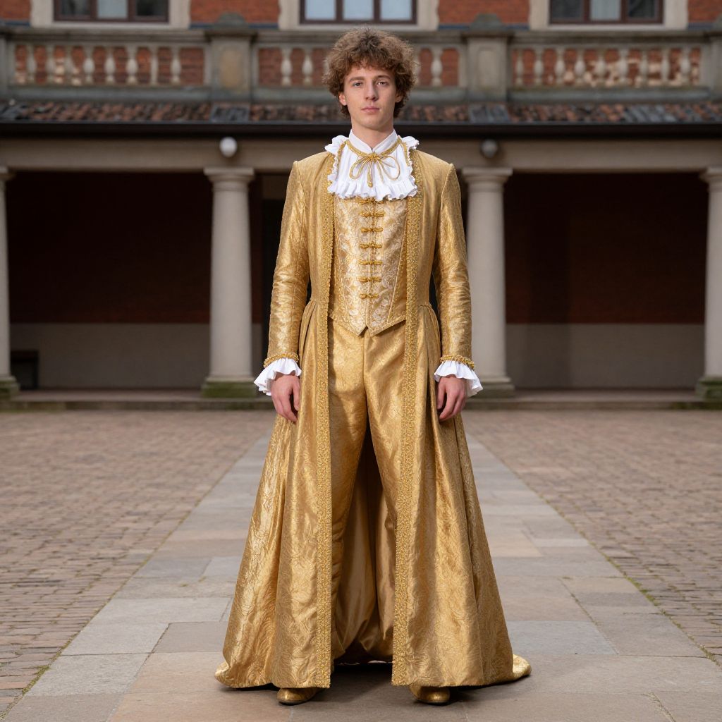 Royal Opera House Costume, dressed in a golden costume standing in a courtyard