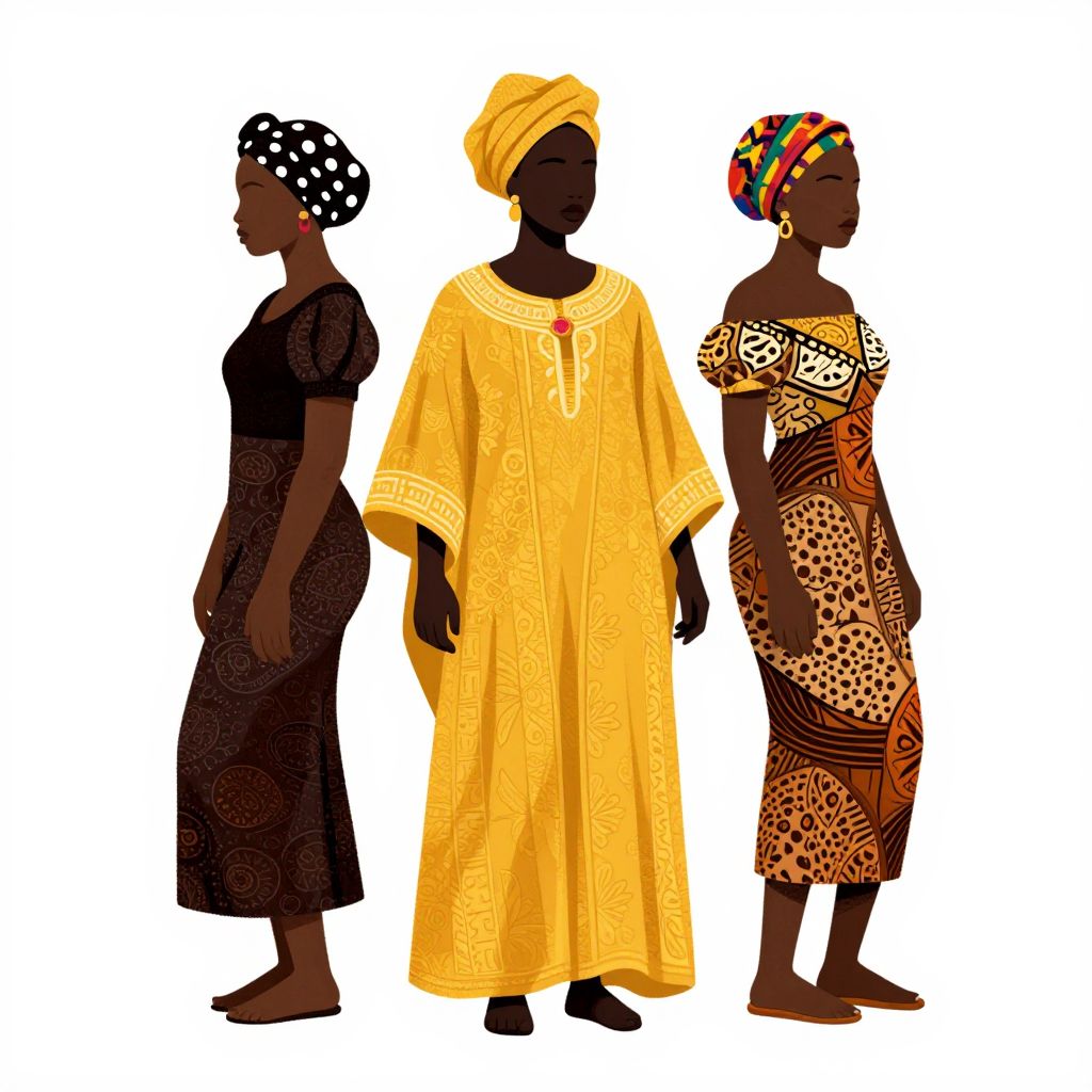 The image presents a striking full-body illustration of three African women, each adorned in traditional attire that exudes a sense of cultural richness and elegance. The women are arranged in a minimalist composition, with their bodies aligned in a staggered formation that creates a dynamic visual flow. The central figure, positioned slightly forward, is dressed in a flowing yellow robe with intricate patterns and a matching headwrap, which adds a sense of unity to the group. The woman to the left is partially visible, wearing a dark dress with a distinctive polka-dot headscarf that contrasts with the vibrant yellow of the central figure. The woman on the right is clad in a patterned dress with a leopard-like texture, complemented by a colorful headscarf that echoes the warm hues of the central figure's attire. The overall composition is harmonious, with the women's outfits and headwear creating a cohesive visual narrative that celebrates African art and tradition.
