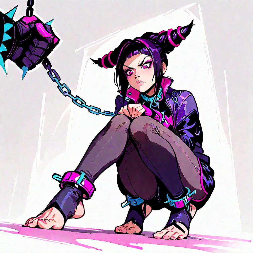 Score_9, score_8_up, score_7_up, score_6_up, score_5_up, score_4_up, , source_cartoon, source_anime, squatting, juri han, (glowing eye:0.5), purple eye, angry, chained collar, chain, leotard, foot focus, toes, stirrup stockings, simple background