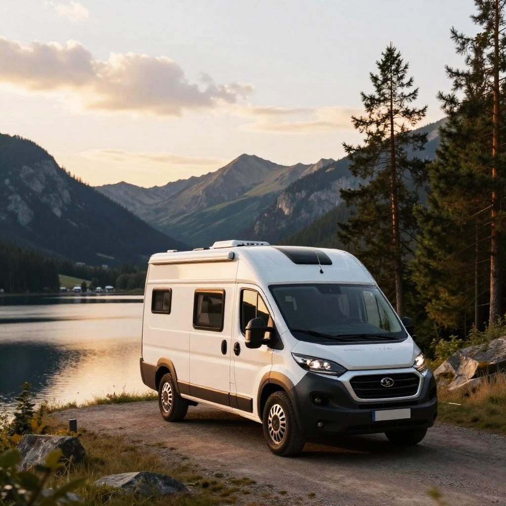 Hymer camper van parked on a scenic mountain overlook during golden hour, surrounded by lush pine trees and a calm lake reflecting the sky, with soft warm sunlight highlighting the vehicle's sleek design, adventure and freedom vibe.